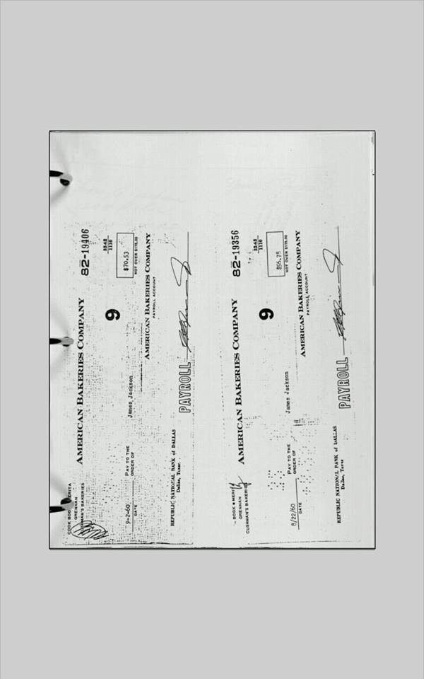 Through the cooperation of the American Bakeries head office in Chicago, the FBI was able to locate two cheques (one being the cheque of note) issued to Jackson, which is questionable, considering it is policy for American Bakeries to discard all cancelled cheques after two years.[27] The cheque that apparently matched this voucher (Number 82-19356), was dated August 22, 1960 (Monday), totalling $56.78, and a second cheque offered for comparison, dated September 2, 1960 (Saturday) (Number 82-19406), totalling $70.53, showing that both had been cashed as a third party cheque.[28] The cheque dated August 22, evidently cashed by Jackson at a Dallas-area A&P grocery store (Store 113), was stamped as being paid by the First National Bank of Dallas on August 25 (Thursday).[29] This in theory would confirm that the cheque’s date was in fact on the 22nd- which was not in sync with the pay periods for American Bakeries. Indeed, Norman Beaton, who was employed at American Bakeries as a tax accountant, stated that temporary employees were sometimes issued cheques at any point of the week, however the amount of the cheque does not coincide with the amount of hours Jackson could possibly have worked within such a short period of time. Potentially, it could have been a pay advance; however, one has to question why a company would issue a pay advance of a full week’s wages to a new part time employee of just days, especially when there was no guarantee that he would work enough hours by the next pay period to reimburse this “loan”. This is curious, considering the next pay cheque would have been the Sept 2 cheque (if the loan reflected the pay period ending on August 27) that was also admitted as evidence (for comparison only), and appears to be a pay cheque, based off full time hours. According to an FBI investigation, Jackson earned $1.66 per hour. Their breakdown gives hours as worked from August 20 through August 27; however, as demonstrated by the reverse of the cheque, the funds were paid on August 25, an anomaly that has never been explained. In short, the timing and amounts of the cheques raises some issues, issues that were never followed up on.